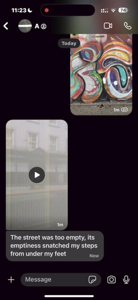 Made for a giant proxy phonescreen in a shop window, I’ve been trying to reach you asks what it means to observe the street within the glassy space of a messaging app. In a context of fleeting and fragmentary attention, the film invites an intimate cinematic encounter conducted through reflected glances and pinged text. A hybrid text exchange sampled from AI-generated image descriptions, performance scripts and Virginia Woolf’s Orlando plays with the poetics of passing by, offering moments that slip between reflection and interruption, dialogue and disconnect.